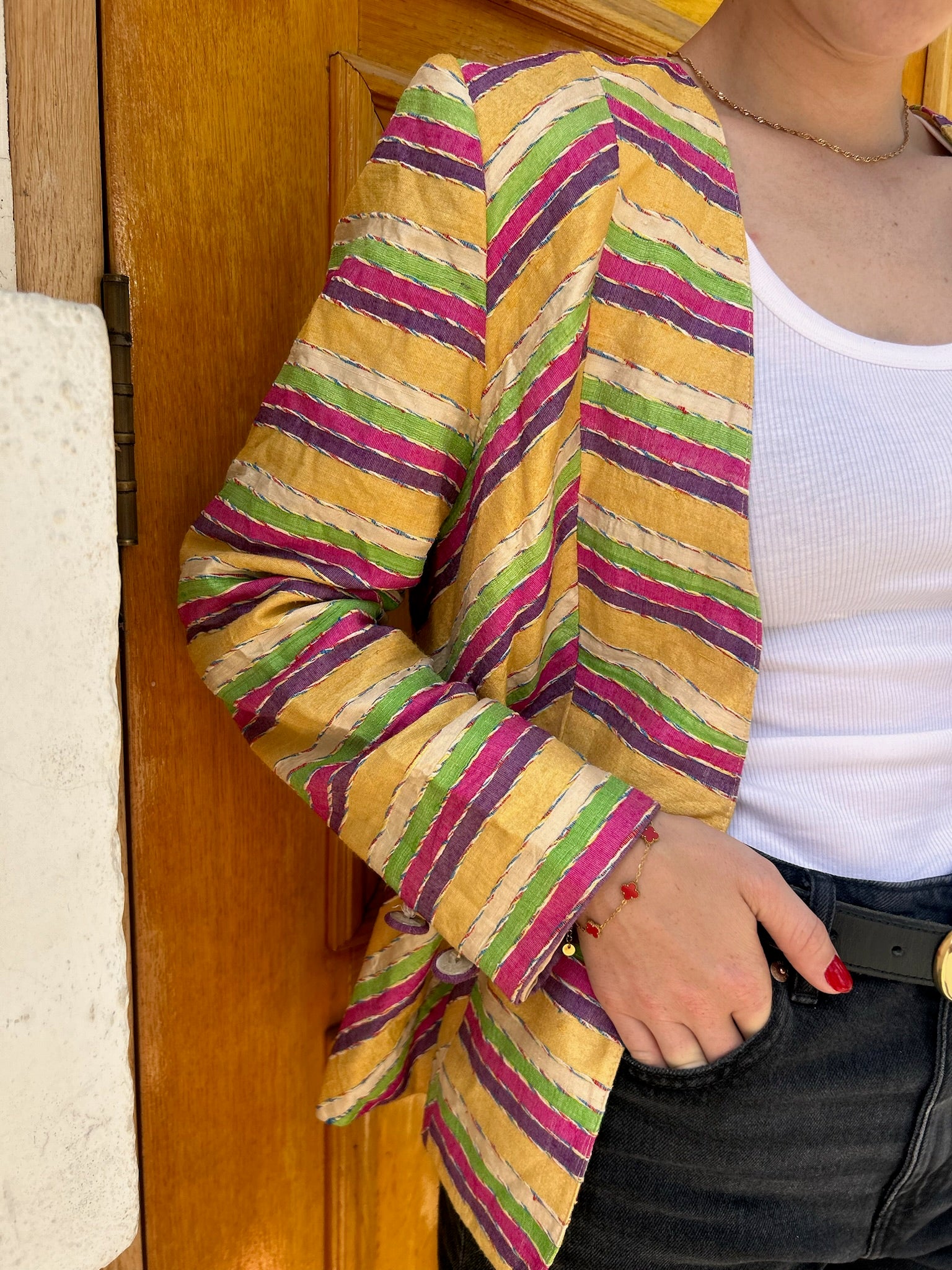 Milano Jacket er en italiensk vintage jakke i linmiks med farger man bare kan drømme om. Super enkel å style for en casual-cool lock, eller til hvitt basis antrekk med «over the top» sko for et mer pyntet utrykk.